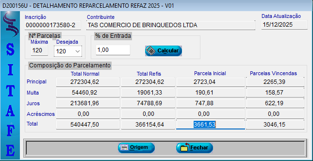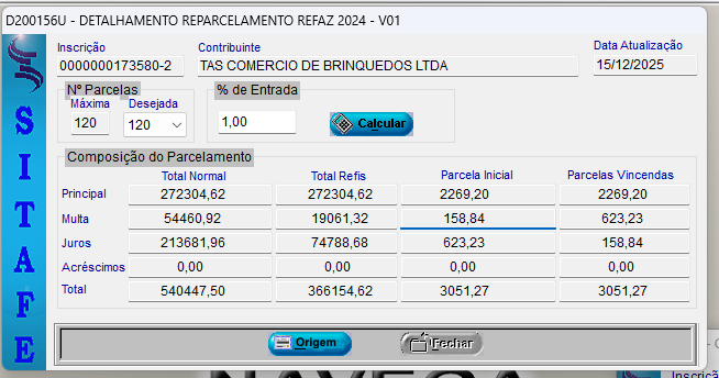 Parametrização conforme regra para garantia para reparcelamentos REFAZ: 1%;